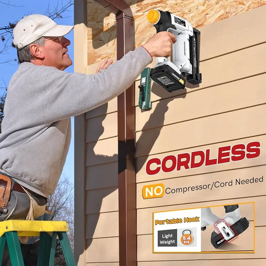 【Adjustable Depth Control: Precision at Your Fin rtips】Fine-tune nailing depth with cordless nail gun for pinpoint accuracy—ensuring every nail embeds perfectly without splitting or damaging materials. Adjust effortlessly: rotate the top-mounted knob right for deeper penetration, left for shallower depth. Say goodbye to guesswork—achieve consistent, professional results on every project