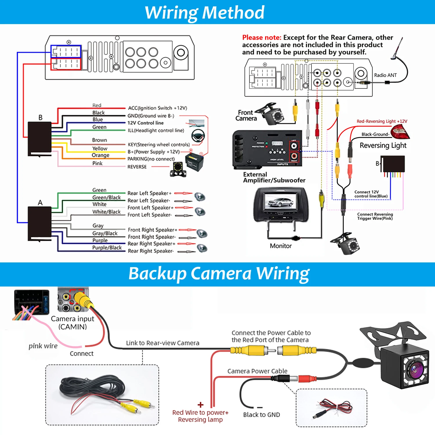 ✔ Yes, our radio supports an external subwoofer. Connection method: Connect to L-OUT and R-OUT, and then connect the blue wire of the B harness to the subwoofer. See the wiring diagram for details.