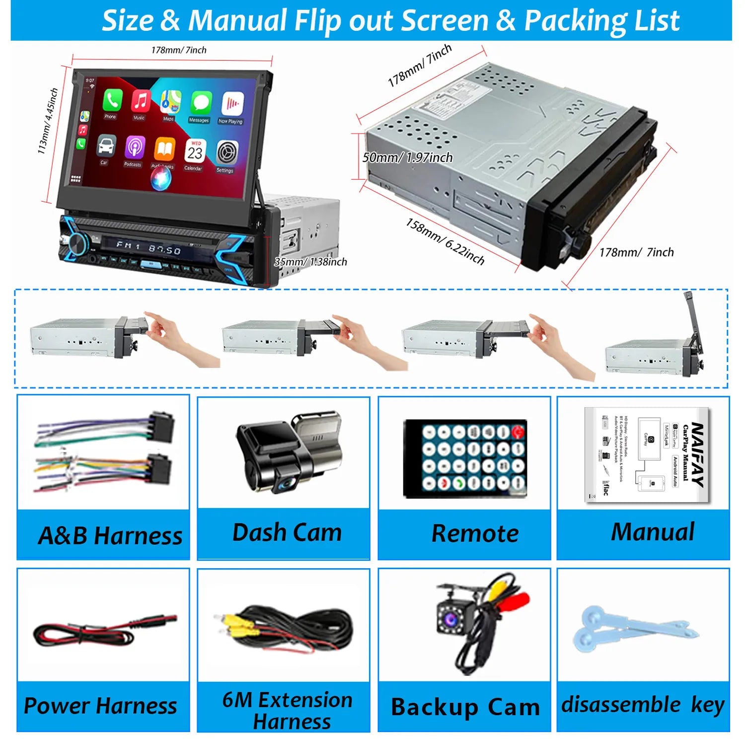 Before you buy, you need to confirm that the size of the in-dash car radio matches your car, and the installation size is 178(L)*50(H)*158(W) mm/7(L)*1.97(H)*6.22(W) inch.
