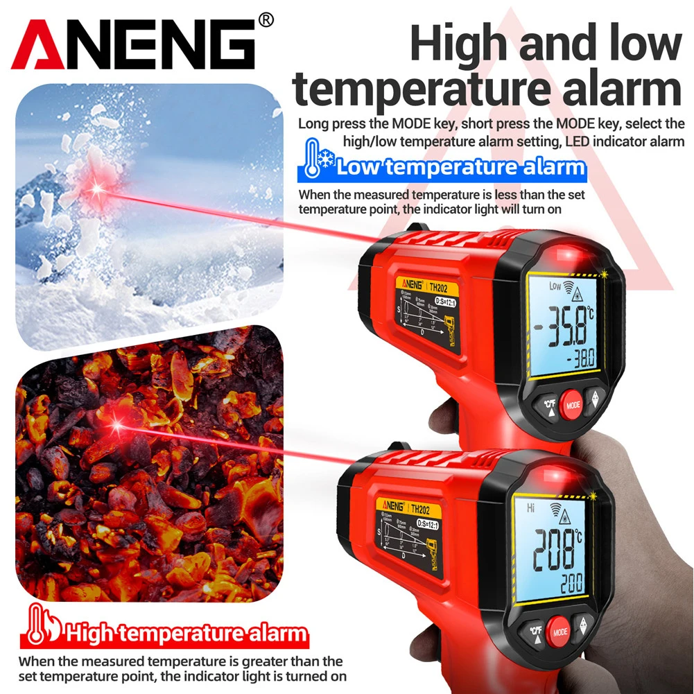3.High-Low Temperature Alarm: By long pressing the MODE button, set high/low-temperature alarms using the pyrometer tester meter, which features LED indicator alert for rapid anomaly detection.