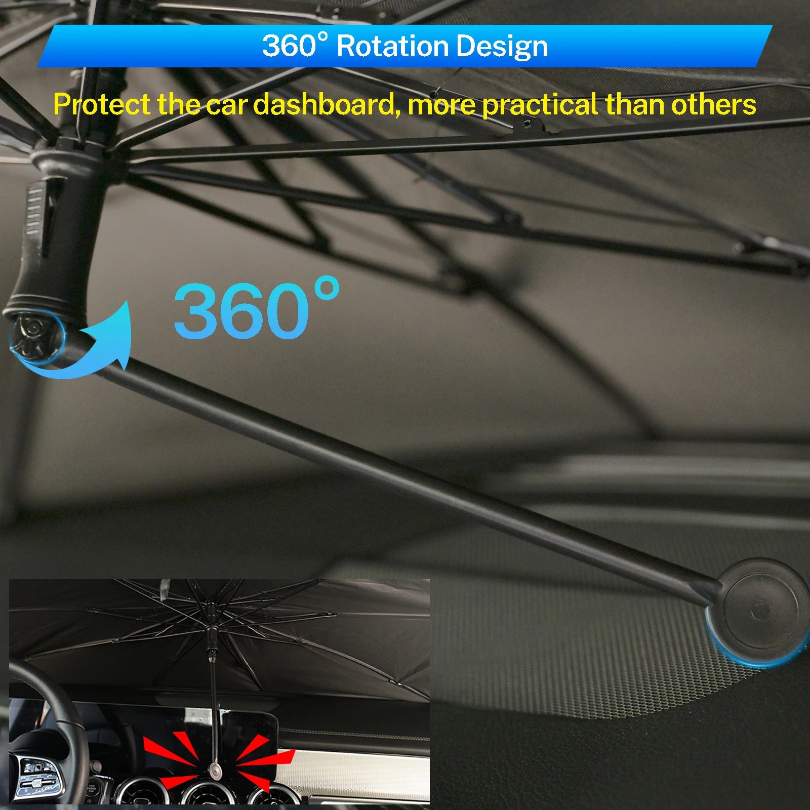 3. Certain Upgraded Designs For The Umbrella - First, a slot is designed on the upper side of each umbrella. With this slot, they can perfectly fit for the windshields or windscreens with rear view mirrors. Second, the unique idea - 360 degrees rotatable and bendable umbrella handle - is taken. The umbrella handles of most of car sun umbrellas can't be rotated at 360 degrees and bendable. However, the umbrella handles of our car sun umbrellas are made from soft plastic and can be 360 degrees rotatable and bendable, which better protect your car center console and dashboard from being scratched.