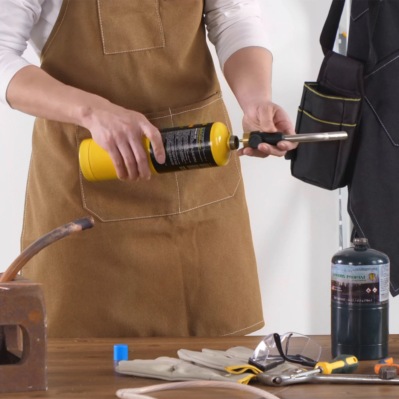 Our Torch Kit can be used with propane, MAPP, or MAP-PRO cylinders with CGA600 connections to produce a high-intensity, adjustable blue flame with a maximum operating temperature of 3730°F, which easily reaches brazing and soldering operating temperatures (for soldering copper tubing up to 3/4-inch).