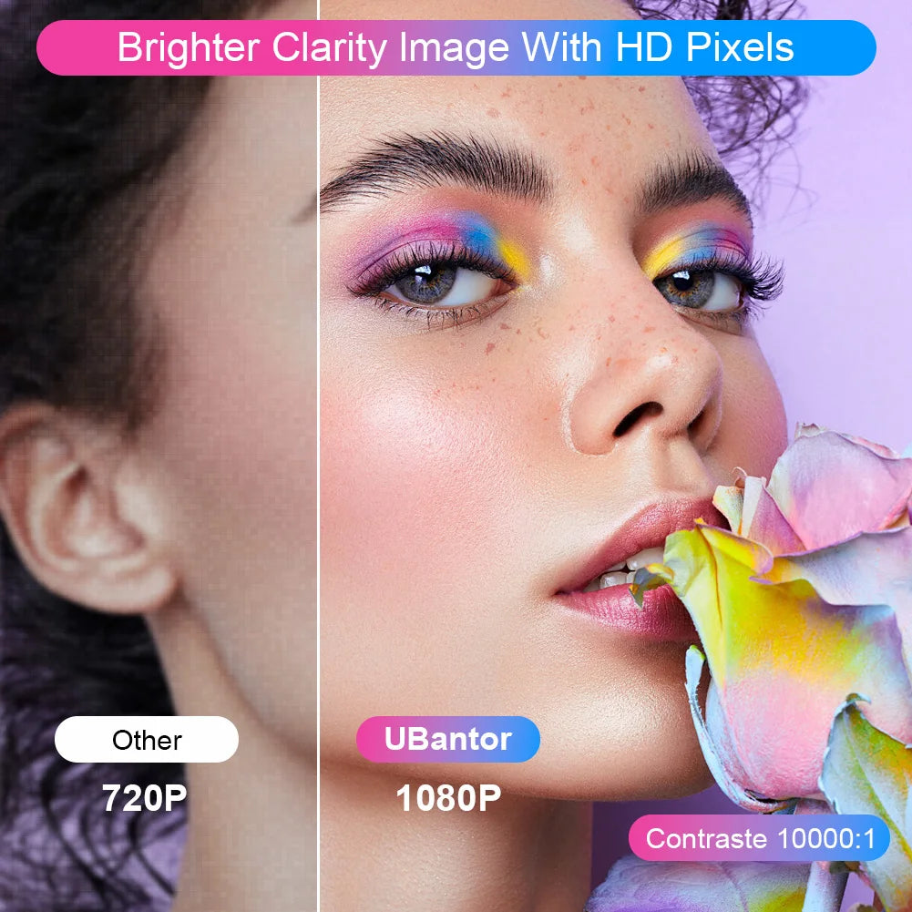 🎁【Native 1080P & 15000 lm】Home projector is a real 1080P full HD projector with an original resolution of 1920*1080 and supports 4K. Lens are comparable to top-level cameras with an accuracy of 0.01mm, composed of multiple high-refractive-index glass lenses. The edge and center of the projected image are in sharp focus, the image quality of 15000 lumens and the ultra-high contrast ratio of 10000:1 provides clearer, brighter, and more colorful detailed image quality.