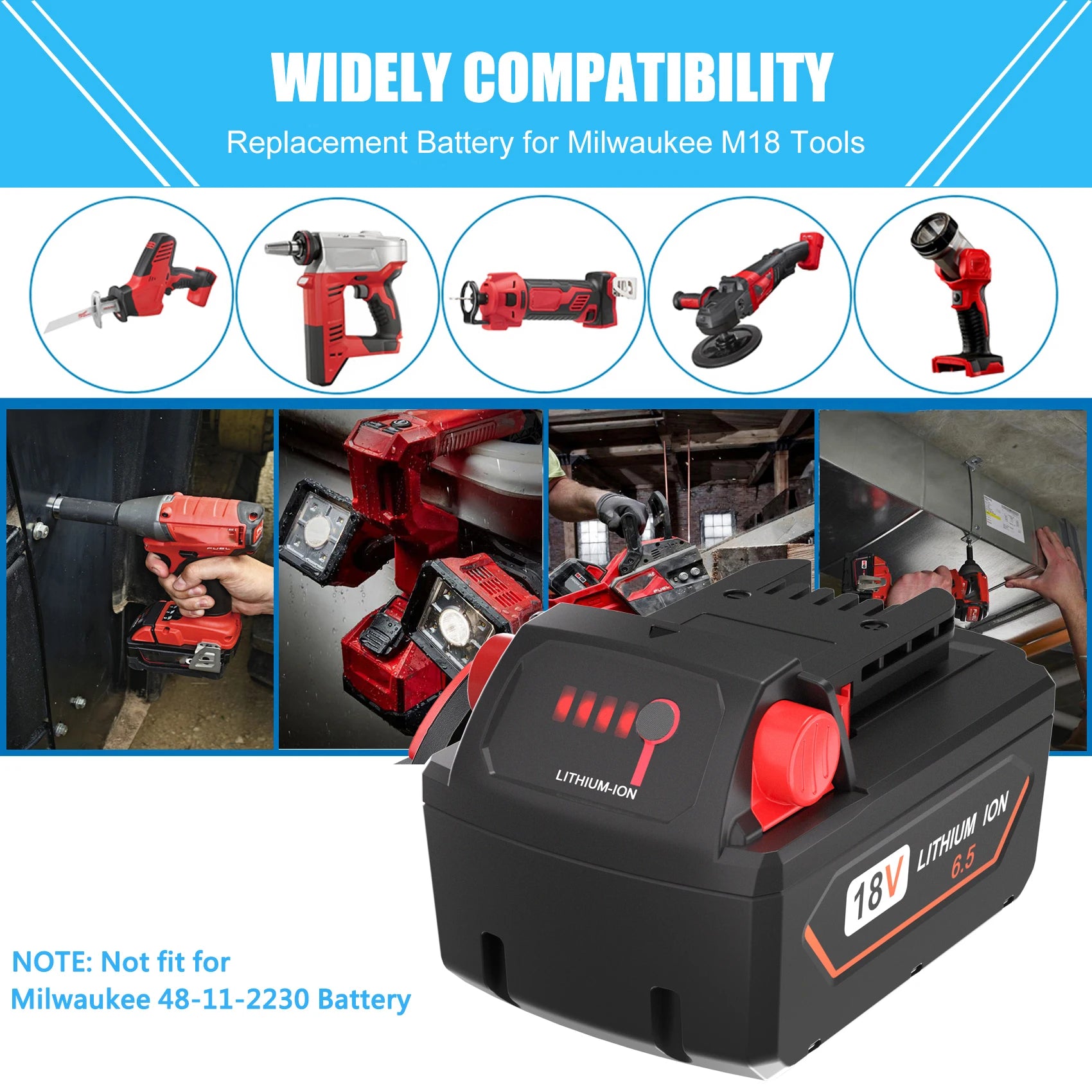 REACELL 18V 6.5/5.5Ah For Milwaukee M18 Battery Rechargeable Milwaukee Lithium Battery 48-11-1860 48-11-1850 48-11-1840