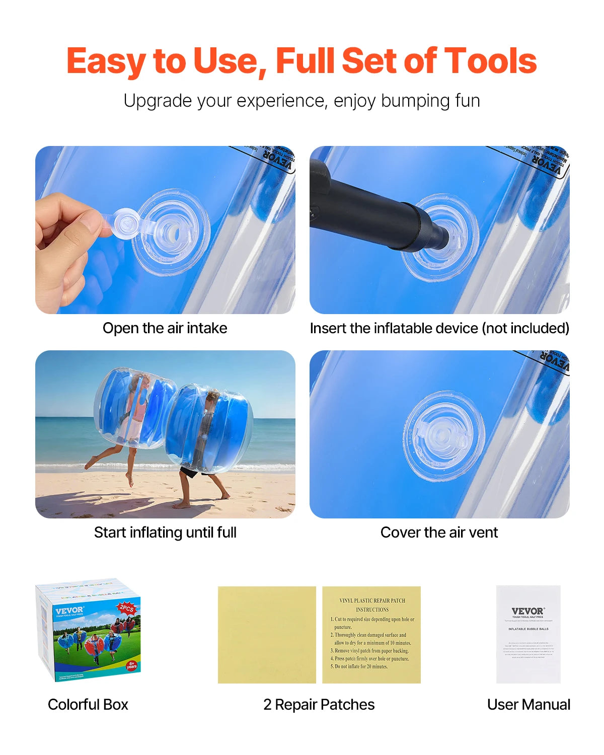Thoughtful Maintenance Kit: The human hamster bubble ball set comes with a user-friendly repair kit, including instructions, 2 patches, and step-by-step guide. Each patch can fix 1-3 small holes. Durable, allowing for years of fun. One full inflation lasts up to 12 hours of use. For future use, the ball must be re-inflated