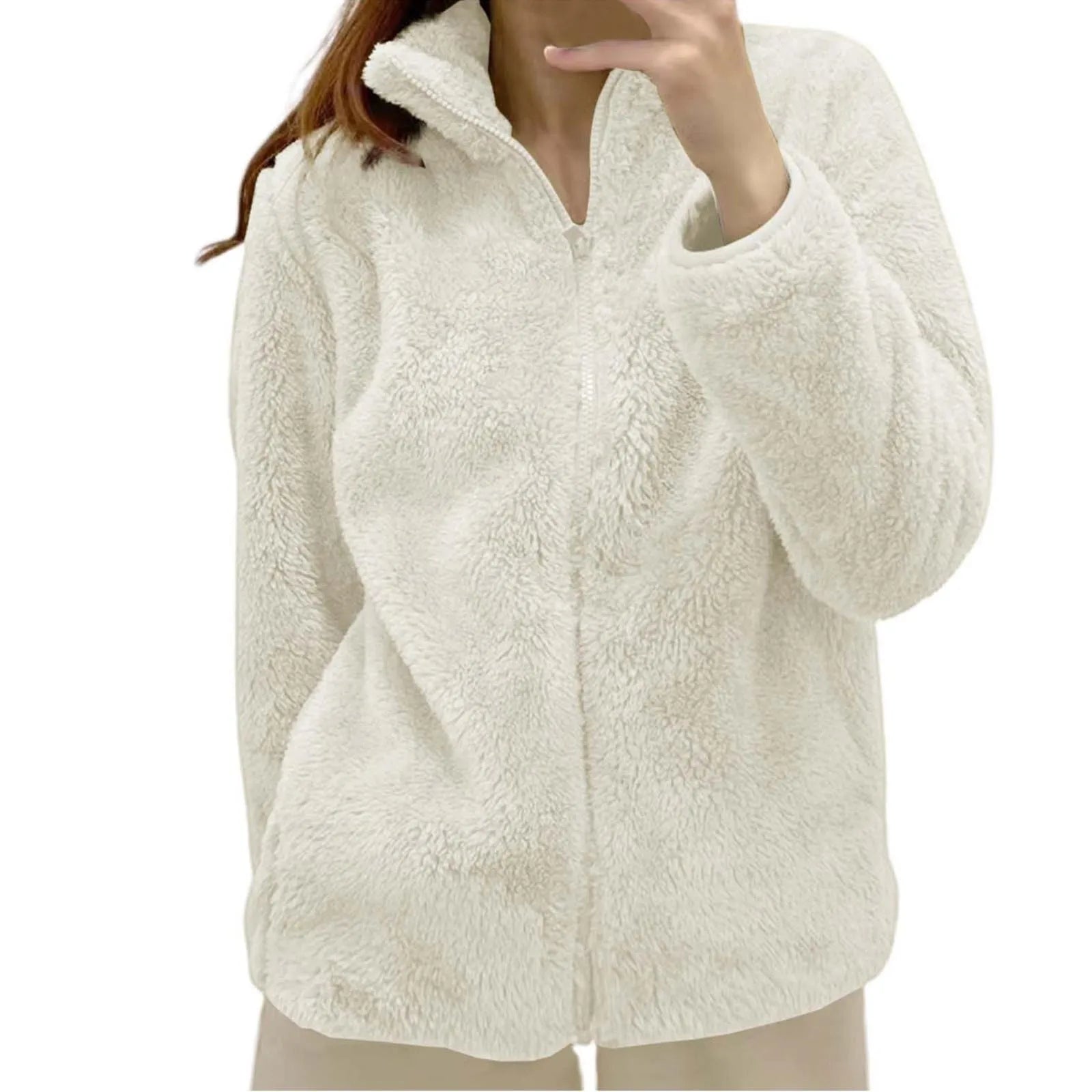 Women Casual Zip Up Fleece Jacket Solid Color Long Plush Polar Warm Zipper Outwears Female Gils Lamb Wool Jackets With Pockets
